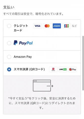 メールアドレスと配送先を指定していただいた後に、「支払い」画面から上記3種類のスマホ決済をご選択ください。